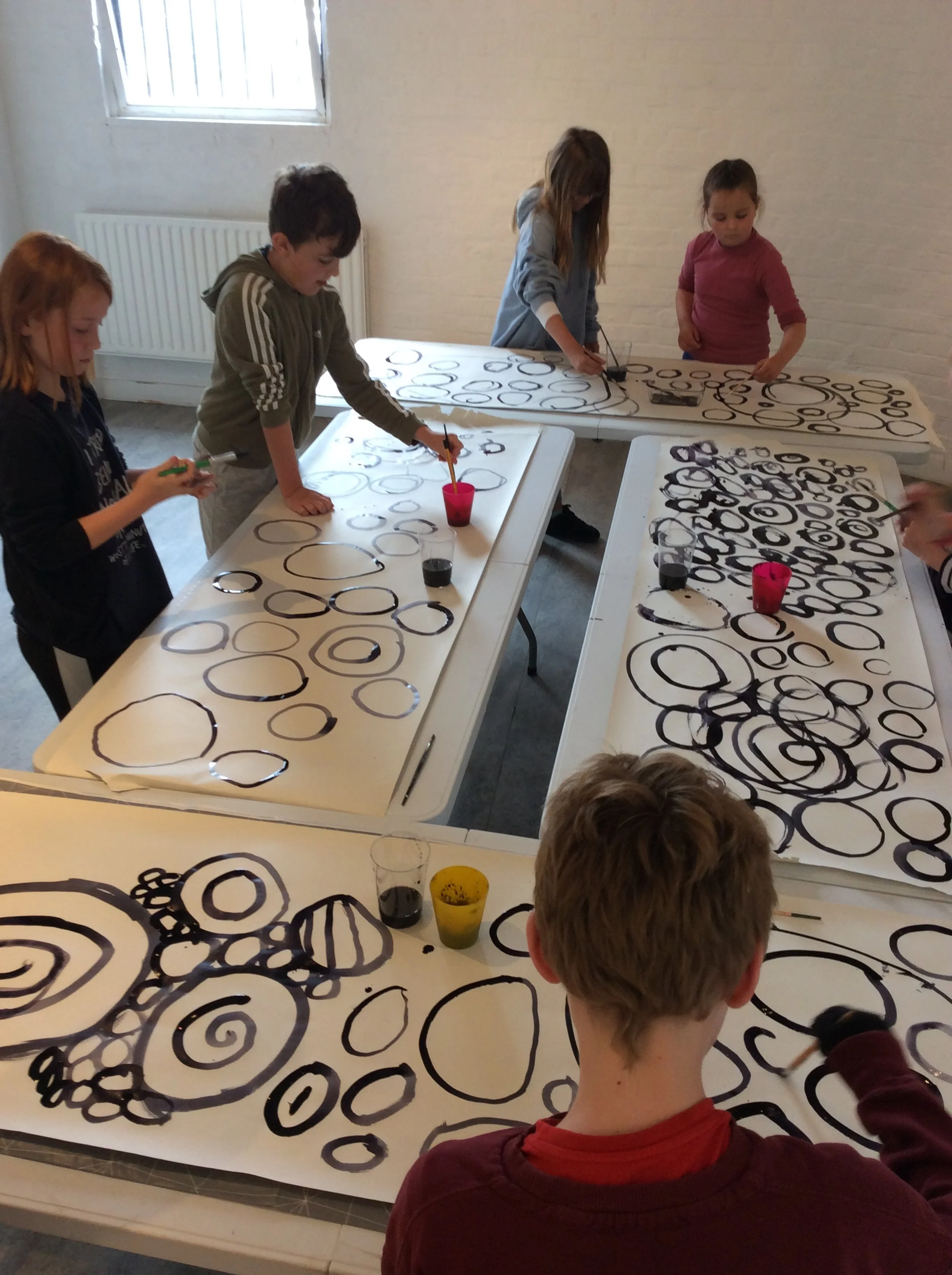 Enzo Circles: The children learned about Enzo circles and experimented with black ink, responding to the circular forms in the exhibition. They tried different combinations of making a circle and finished trying to make a perfect circle in one motion.