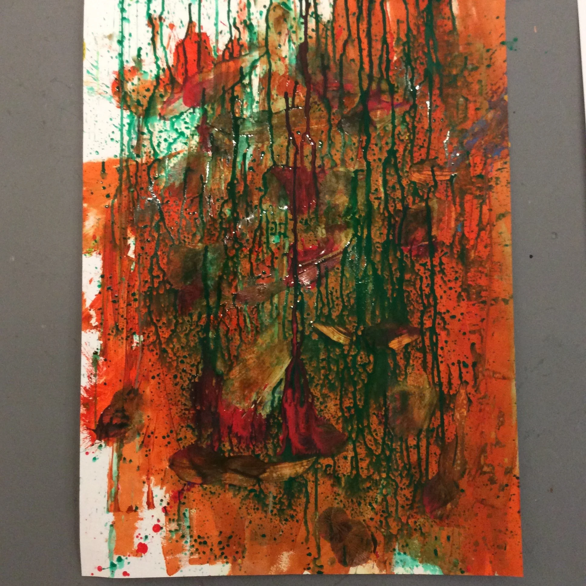 The students then moved into the creative space at the end of the exhibition, where they experimented with mark-making. Inspired by the prompts, props, and materials provided, they explored various techniques, including waterfall-inspired dripping effects.