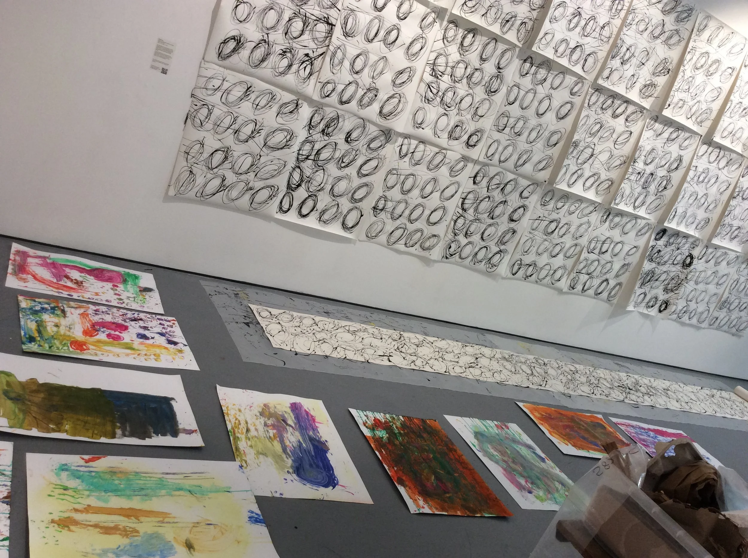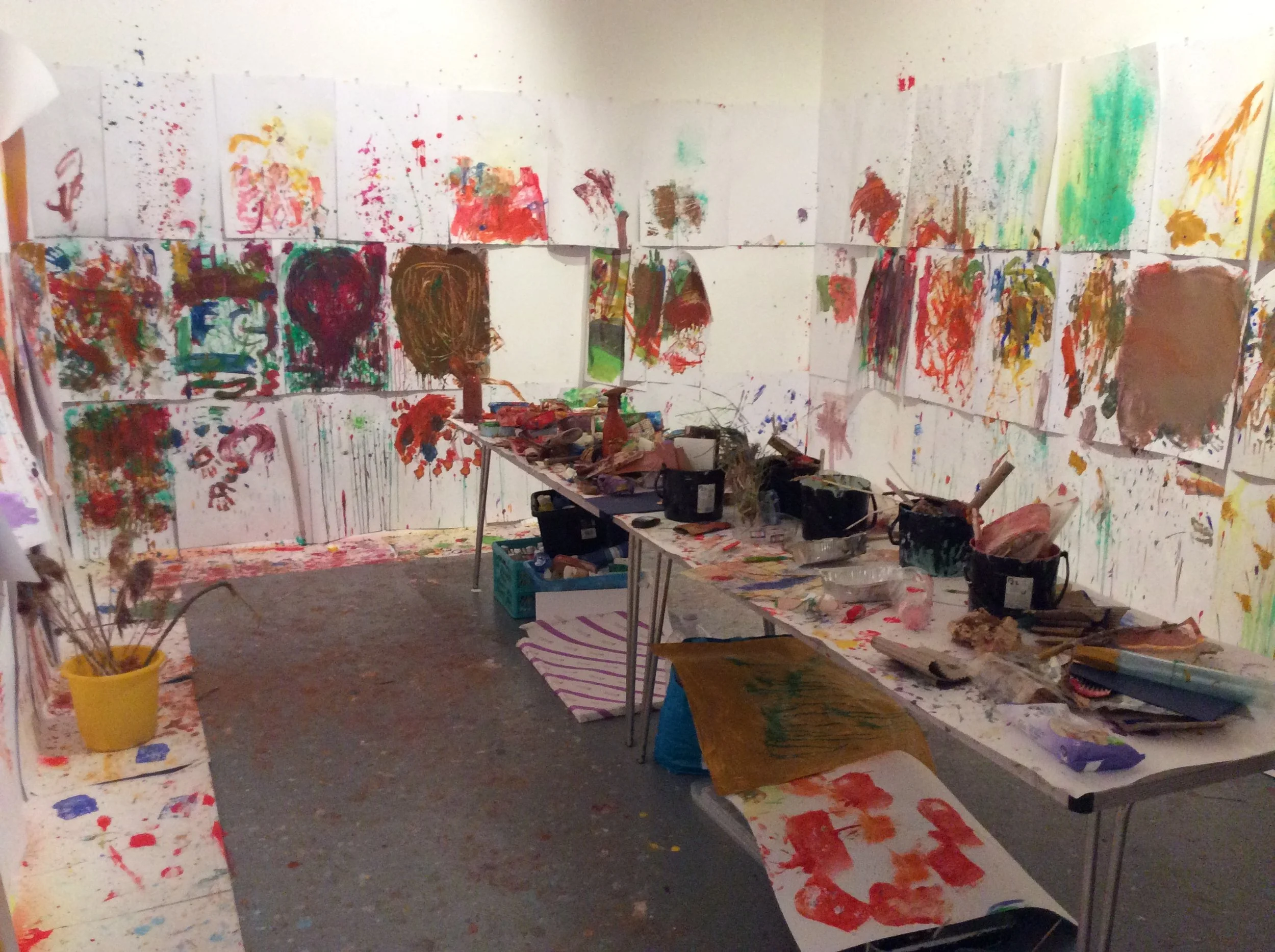 A series of abstract mark-making sessions took place during DRIP SPLATTER SMEAR in a messy space created by Laura in the West Gallery, Quay Arts.